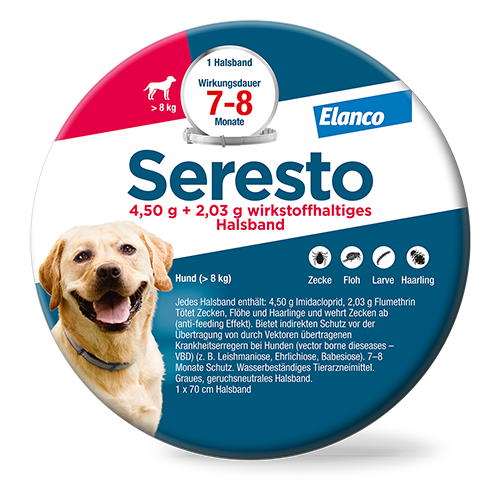 Das Seresto® Hundehalsband wehrt und tötet Zecken und tötet Flöhe ab - ganz einfach durch Kontakt mit dem behandelten Hund. Das bedeutet, Zecken müssen Ihren Hund erst gar nicht stechen, um wirksam abgetötet zu werden. So wird indirekt das Risiko für die Übertragung bestimmter Erreger durch Zeckenstiche verringert.